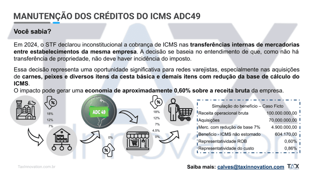 Essa decisão representa uma oportunidade significativa para redes varejistas, especialmente nas aquisições de carnes, peixes e diversos itens da cesta básica e demais itens com redução da base de cálculo do ICMS. O impacto pode gerar uma economia de até 1,65% sobre a receita bruta da empresa.